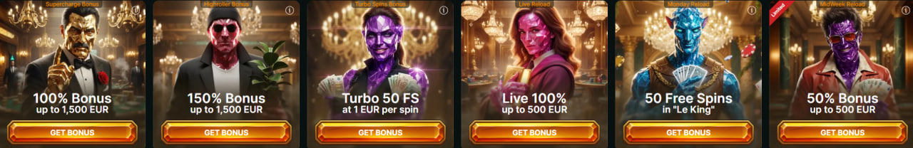 Na het welkomstpakket houdt Luckygem Casino de intensiteit hoog dankzij een reeks extra promoties die zich richten op verschillende soorten spelers. In het promotiegedeelte vind je onder meer de Supercharge Bonus met 100% tot €1.500, de Highroller Bonus met 150% tot €1.500, de Turbo Spins Bonus met 50 free spins van €1 per spin, de Live Reload met 100% tot €500, de Monday Reload met 50 gratis spins in Le King en de MidWeek Reload met 50% tot €500. Daardoor oogt de bonussectie niet eentonig, maar juist gevarieerd en aantrekkelijk voor liefhebbers van slots, live casino, grotere stortingen en terugkerende spelers.
