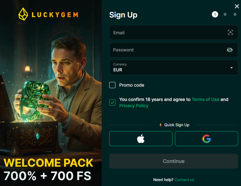 Registreren bij Lucky Gem is eenvoudig en duidelijk, zelfs voor nieuwe gebruikers. Op het aanmeldingsformulier moet u de belangrijkste gegevens invullen, waarna u naar de volgende stap kunt gaan en het aanmaken van uw profiel kunt afronden. De interface van de pagina is overzichtelijk: alle belangrijke velden staan op één plek, waardoor het proces slechts enkele minuten in beslag neemt.