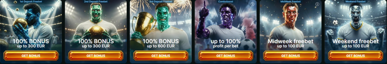 Voor sportwedders zijn er in het promotiegedeelte bovendien aparte freebet-aanbiedingen beschikbaar, wat het bonuspakket duidelijk uitgebreider en aantrekkelijker maakt. Zo is er de 1st Deposit Freebet met een 100% bonus tot €300, gevolgd door de 2nd Deposit Freebet, eveneens met 100% tot €300, en de 3rd Deposit Freebet met een verhoogde bonus van 100% tot €600. Daarnaast is er Comboboost, waarmee de winst van een combinatiebet met tot 100% per weddenschap kan worden verhoogd. Voor spelers die ook na de eerste stortingen actief blijven, zijn er extra tijdelijke promoties zoals de MidWeek Freebet tot €100 en de Weekend Freebet tot €100. Deze reeks vormt een logische aanvulling op het basisbonuspakket, omdat ze niet alleen gericht is op nieuwe spelers, maar ook op gebruikers die regelmatig inzetten tijdens de week of in het weekend.