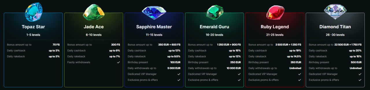 Het programma bestaat uit 30 levels, verdeeld over zes statussen, waarbij elke nieuwe rang extra privileges opent. In de beginfase liggen de voordelen vooral bij free spins en een basispercentage cashback en rakeback, maar vanaf Jade Ace worden ook snellere uitbetalingen toegevoegd. Vanaf Sapphire Master krijgen spelers daarnaast toegang tot een verjaardagscadeau, een hogere dagelijkse uitbetalingslimiet tot € 5.000, een persoonlijke VIP-manager en exclusieve promoties en aanbiedingen. Op nog hogere niveaus, zoals Emerald Guru, Ruby Legend en Diamond Titan, stijgen zowel de bonusbedragen als de servicevoorwaarden verder, met dagelijkse uitbetalingen tot € 10.000 of zelfs onbeperkte opnames.
