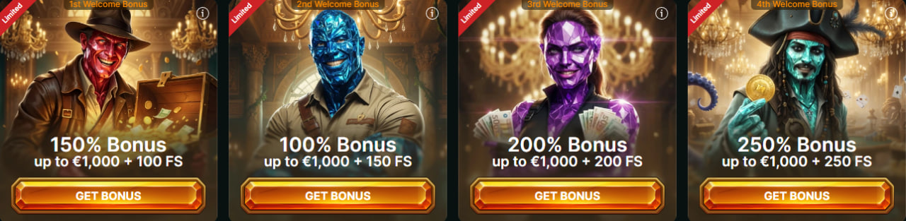 Voor nieuwe gebruikers is er een welkomstpakket van in totaal 700% + 700 FS, verdeeld over vier stortingen. Deze opbouw maakt de promotie overzichtelijk en aantrekkelijk voor spelers die niet alles in één keer willen activeren. De eerste bonusfase biedt 150% tot €1.000 + 100 free spins, de tweede geeft 100% tot €1.000 + 150 free spins, de derde levert 200% tot €1.000 + 200 free spins op, en de vierde storting wordt beloond met 250% tot €1.000 + 250 free spins. Zo krijgt een nieuwe speler niet alleen een sterke start, maar ook extra motivatie om het platform stap voor stap verder te verkennen.